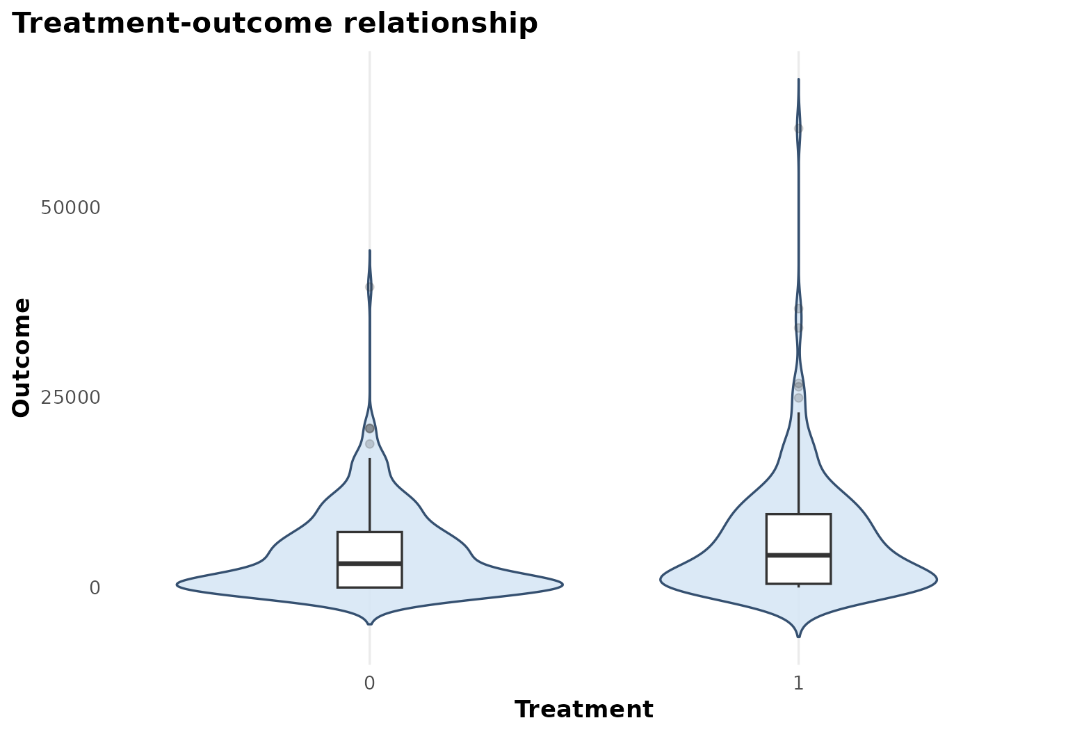 The raw treatment-outcome view gives the scale of the earnings outcome and helps contextualize the subgroup-specific effect estimates.