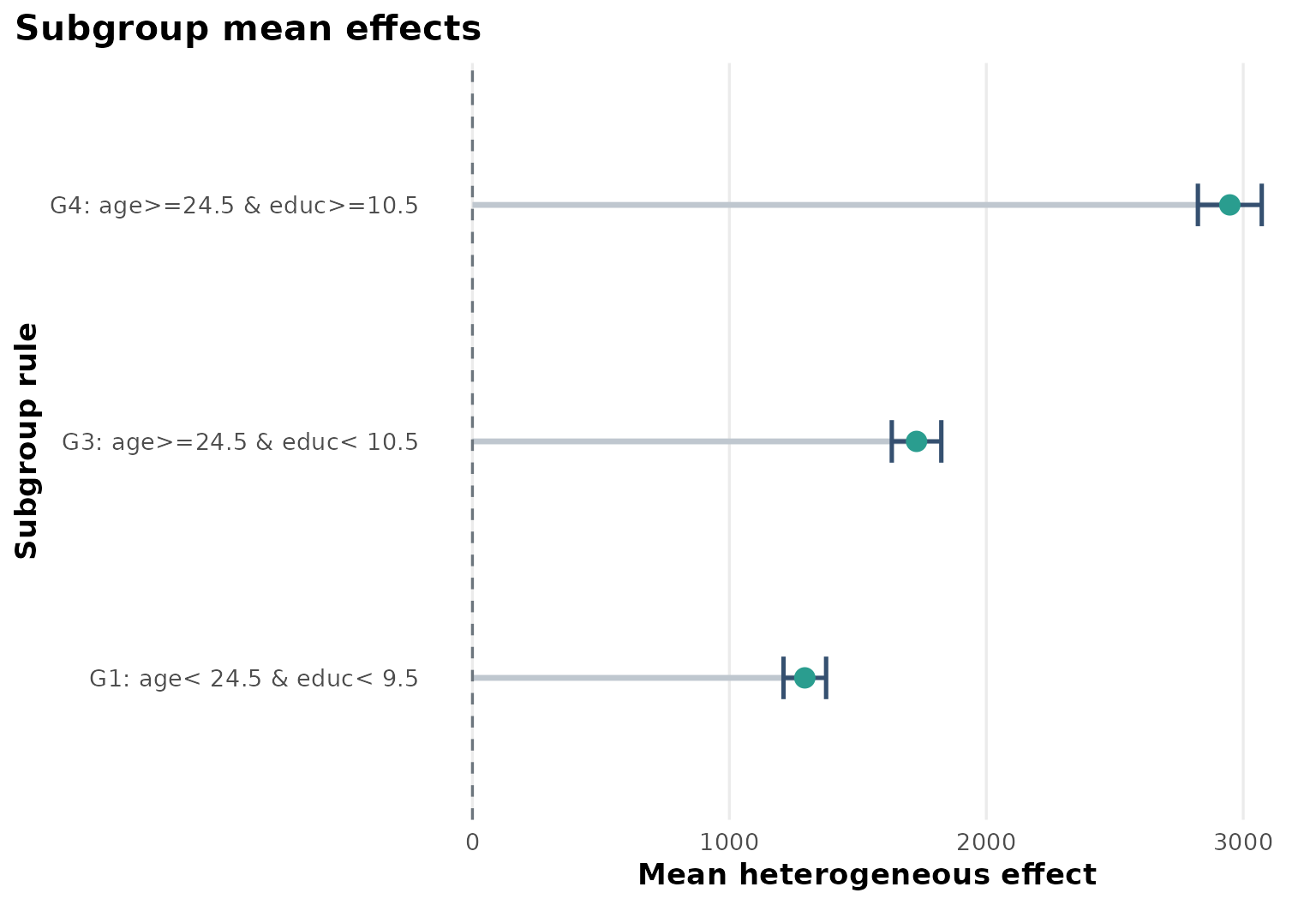 The subgroup summary shows a clear gradient: older and more educated strata in this analysis tend to have larger predicted earnings gains than the youngest, least educated stratum.