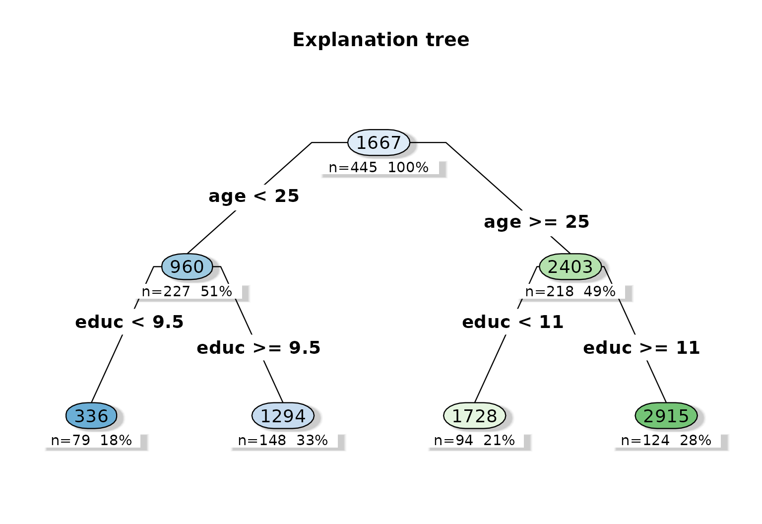 The explanation tree provides a readable program-evaluation story. Age and education dominate the first splits, which aligns with an economic hypothesis that labor-market readiness modifies the returns to training.