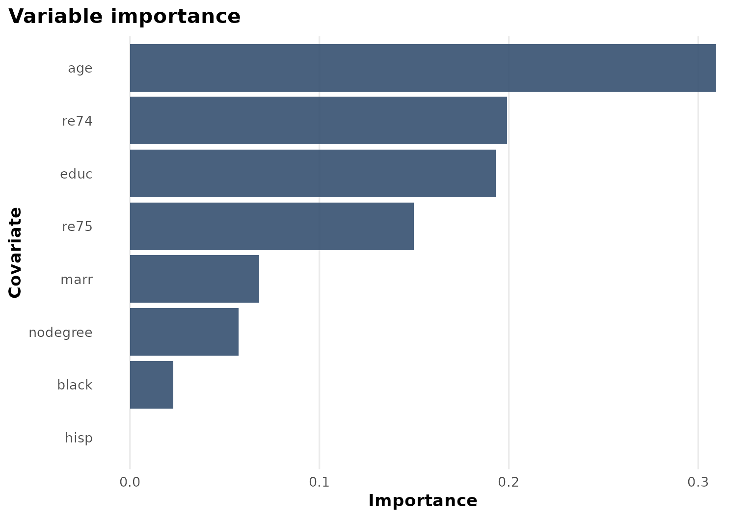 Lagged earnings also appear among the leading variables, which is consistent with the idea that pre-program attachment to the labor market helps organize treatment heterogeneity.