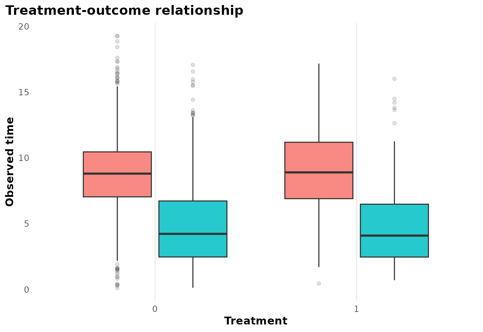 The treatment-outcome panel gives a first sense of follow-up scale and censoring.