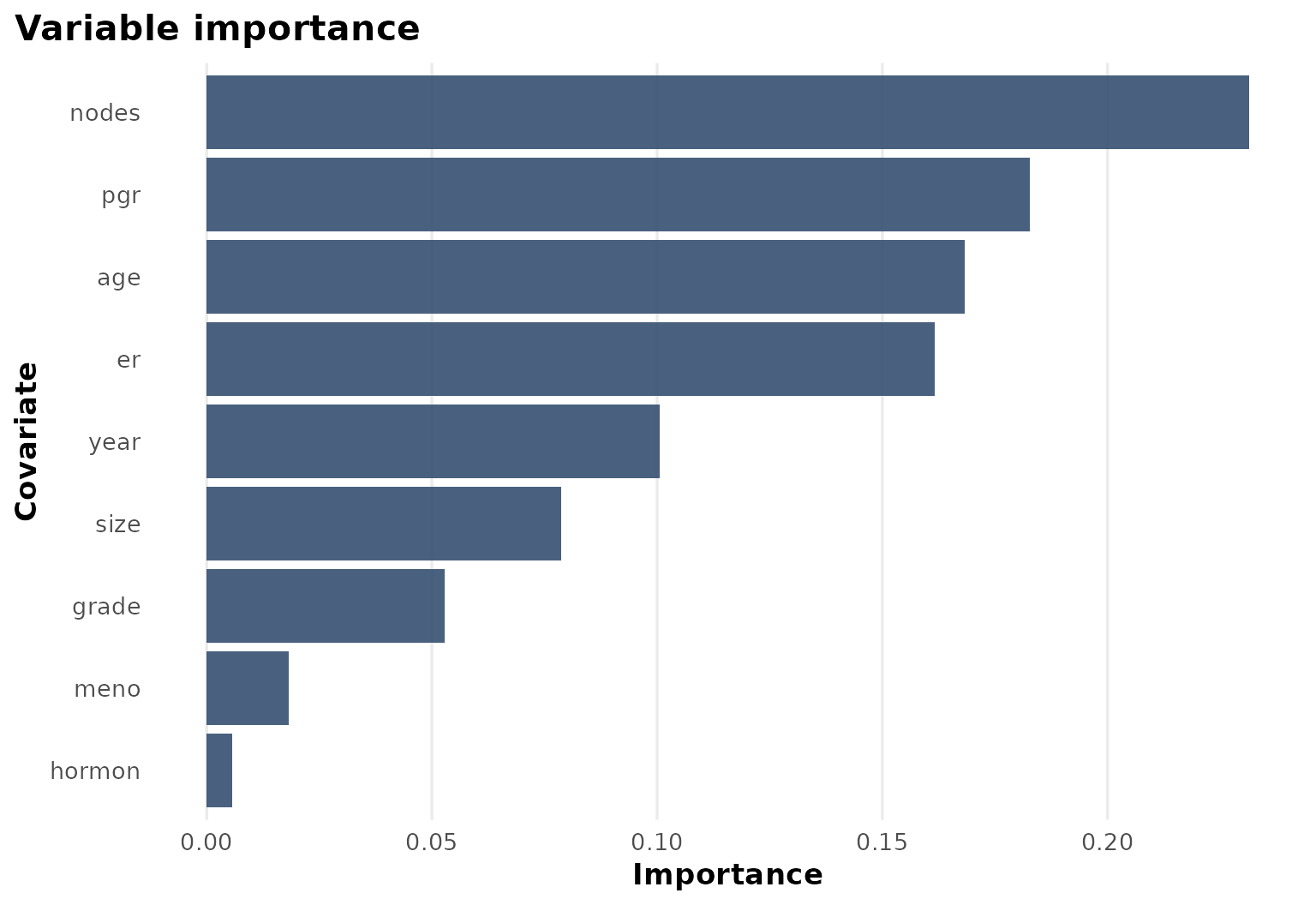 The importance ranking confirms that biologically meaningful covariates drive most of the heterogeneity in this example.