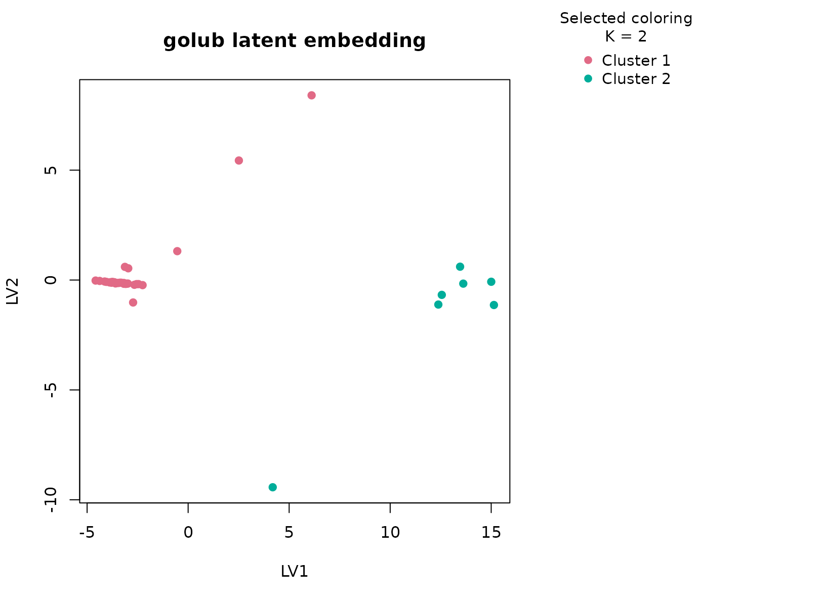 plot_embedding(fit_golub, color_by = "selected", main = "golub latent embedding")
