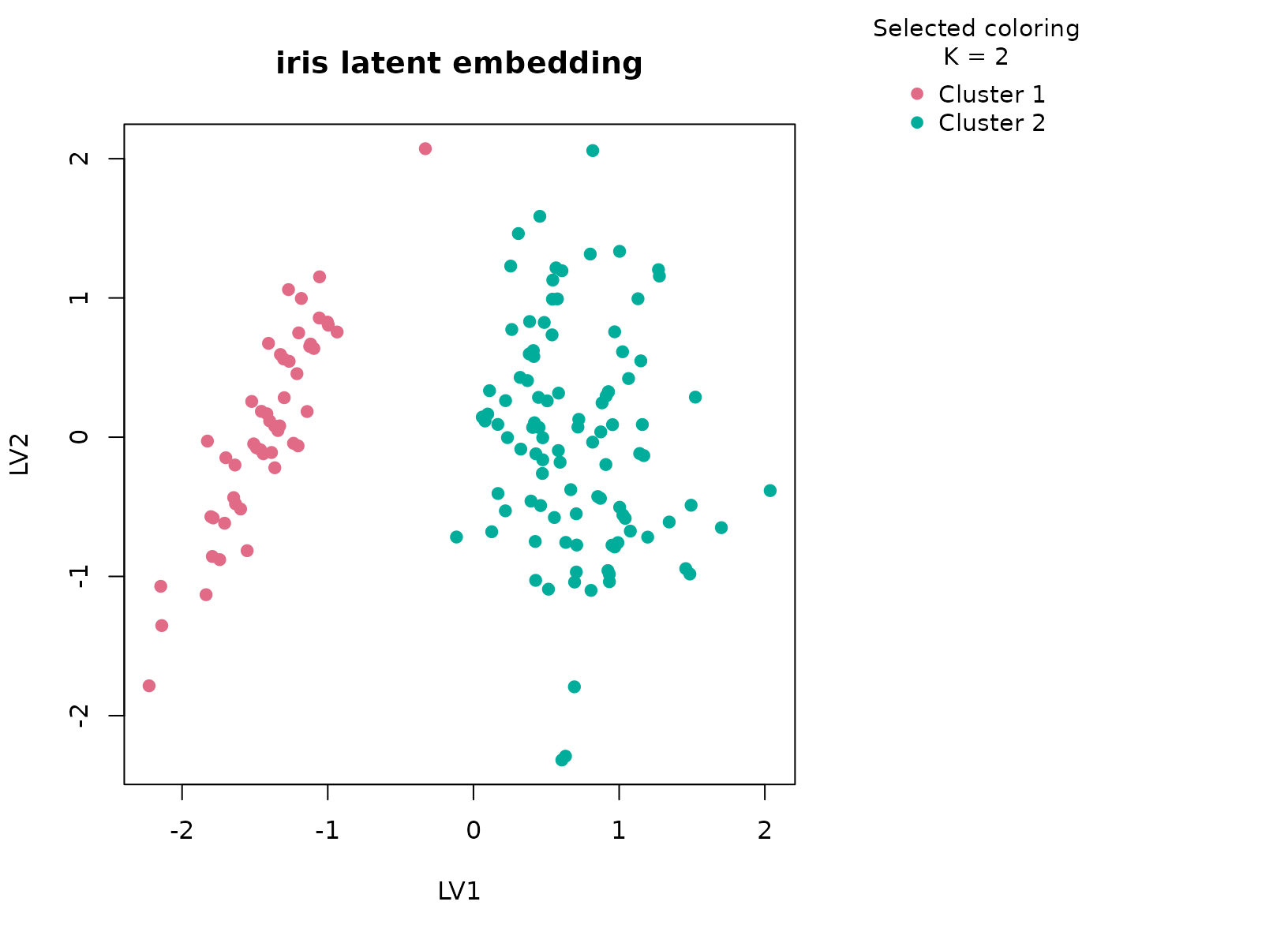 plot_embedding(fit_iris, color_by = "selected", main = "iris latent embedding")
