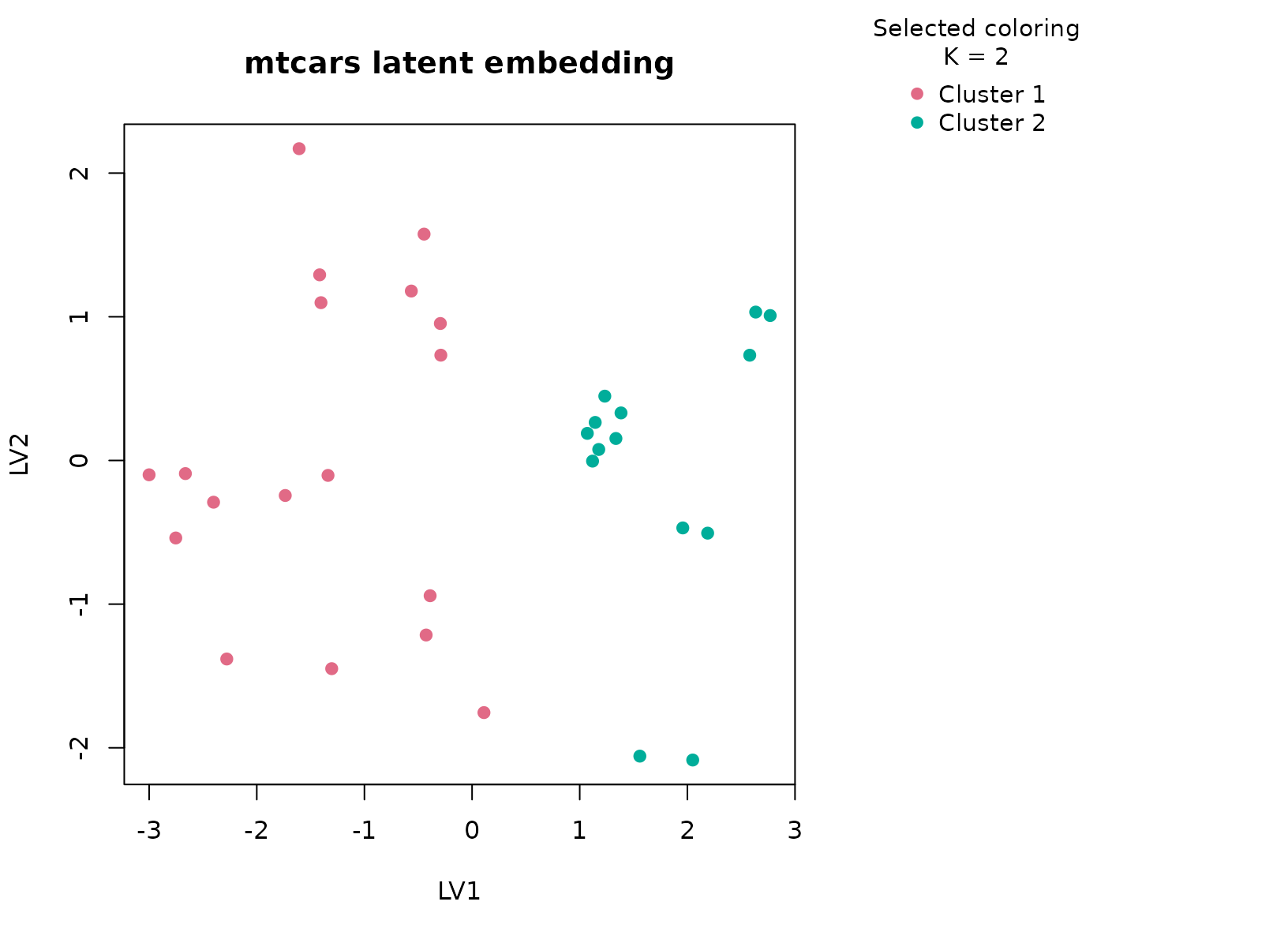 plot_embedding(fit_cars, color_by = "selected", main = "mtcars latent embedding")