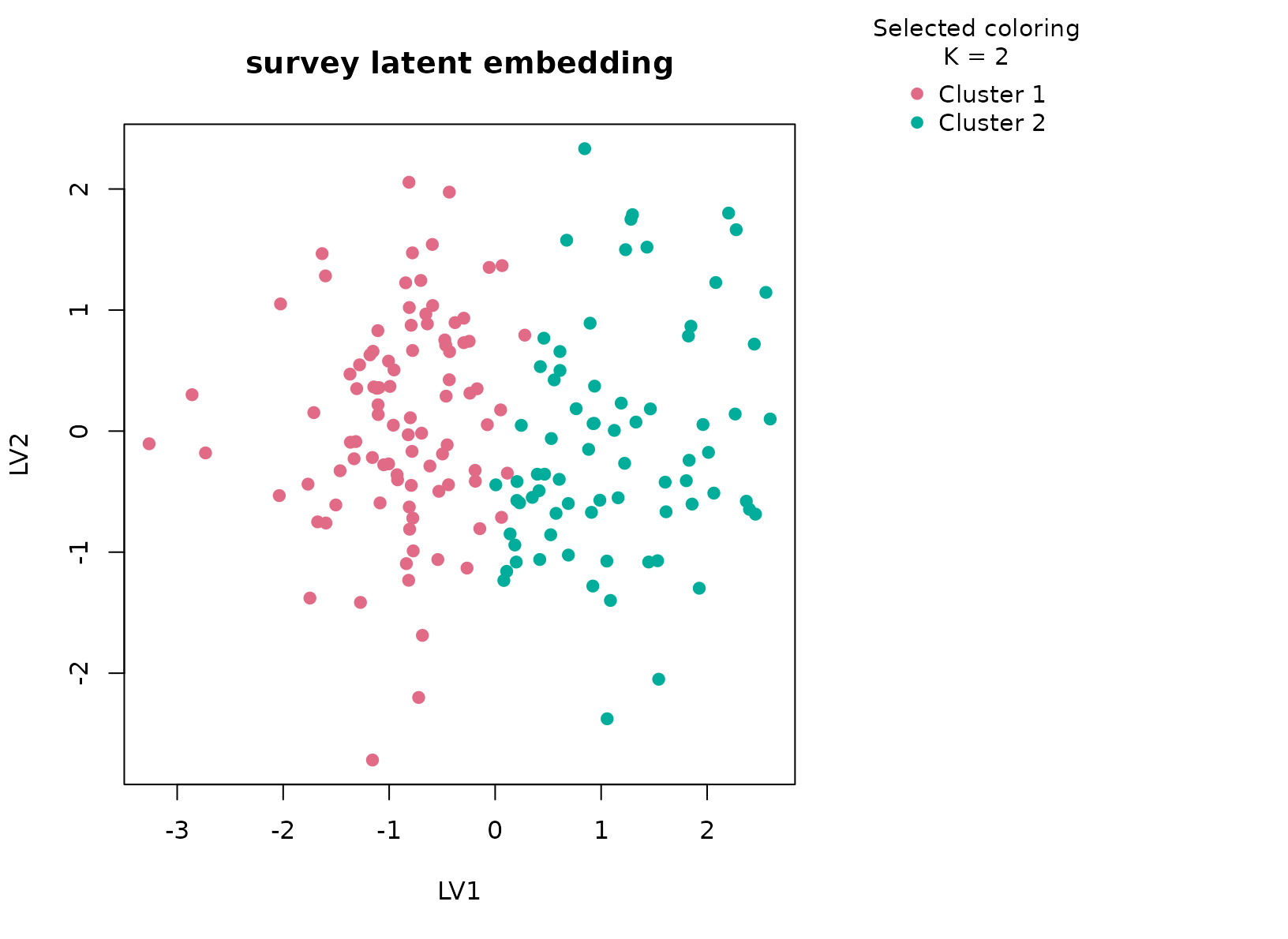 plot_embedding(fit_survey, color_by = "selected", main = "survey latent embedding")